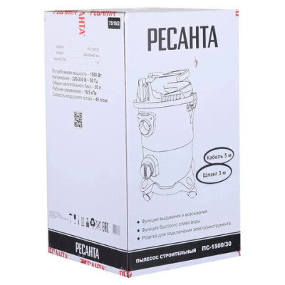 Пылесос хозяйственный РЕСАНТА ПС-1500/30, 1500 Вт, сухая/влажная уборка, сила всасывания 300 Вт, бак 30 л, 75/19/2
