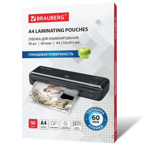 Пленки-заготовки для ламинирования А4, КОМПЛЕКТ 50 шт., 60 мкм, BRAUBERG, 533111