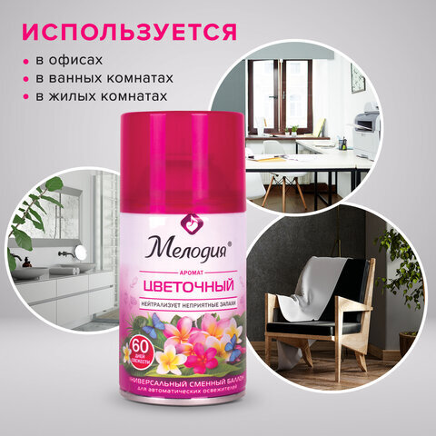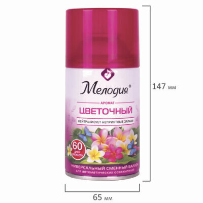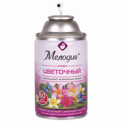 Сменный баллон МЕЛОДИЯ "Цветочный" быстро и эффективно устраняет неприятные запахи и освежает воздух в жилых и бытовых помещениях. Имеет приятный стойкий аромат, который надолго наполнит помещение свежестью.