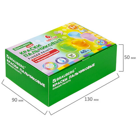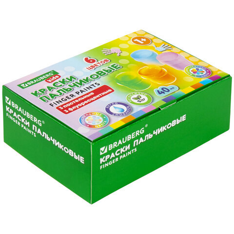 Краски пальчиковые для малышей от 1 года, 6 цветов (3 пастельных + 3 флуоресцентных) по 40 мл, BRAUBERG KIDS, 192400