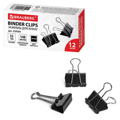 Зажимы для бумаг BRAUBERG, КОМПЛЕКТ 12 шт., 32 мм, на 140 листов, черные, картонная коробка, 220560