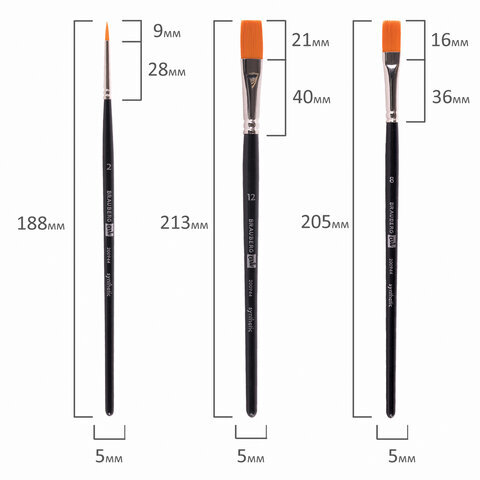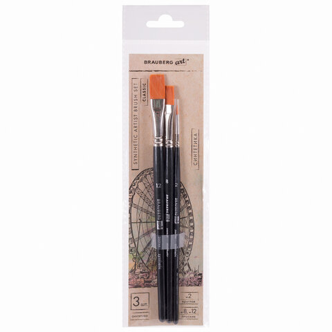 Кисти художественные BRAUBERG ART CLASSIC, набор 3 штуки, синтетика (круглая № 2, плоские № 8, 12), 200944