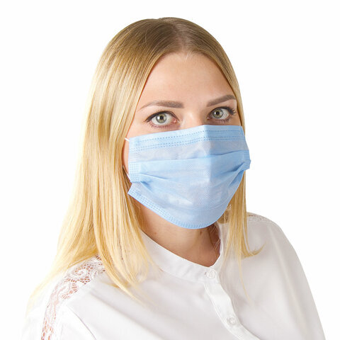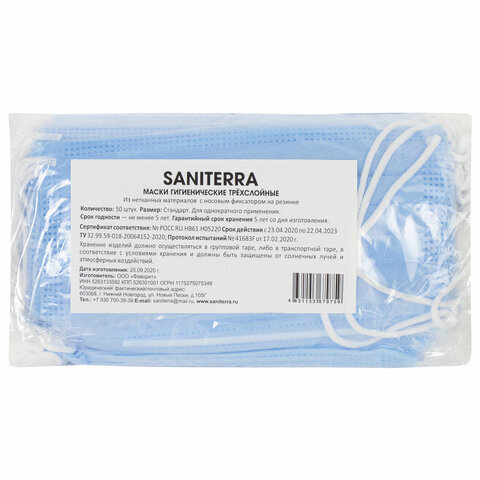 Маски одноразовые КОМПЛЕКТ 50 штук, 3-х слойные, голубые, SANITERRA