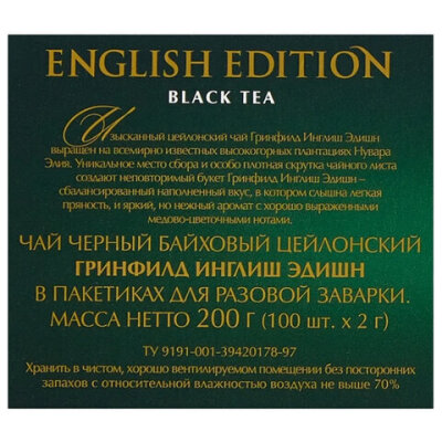 Чай GREENFIELD "English Edition" черный цейлонский, 100 пакетиков в конвертах по 2 г, 1383-09