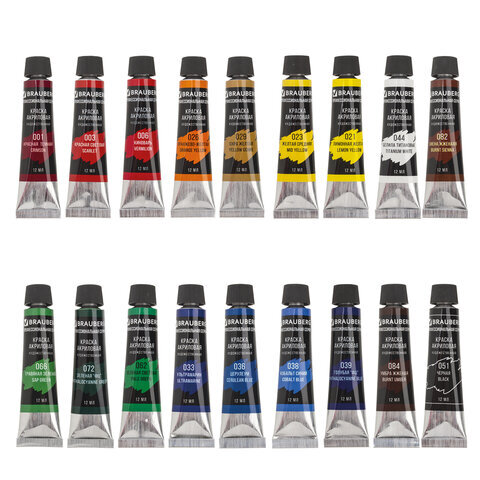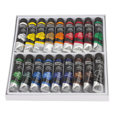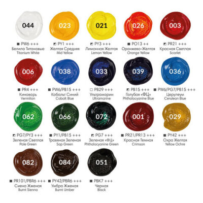 | Цвет | белила титановые (044), голубой ФЦ (039), желтая средняя (023), зеленый светлый (062), зеленый ФЦ (072), киноварь (006), кобальт синий (038), красная светлая (003), красная темная (001), лимонная желтая (021), оранжево-желтый (026), охра желтая (029), сиена жженая (082), травяной зеленый (066), ультрамарин (033), умбра жженая (084), церулеум (036), черный (051) |