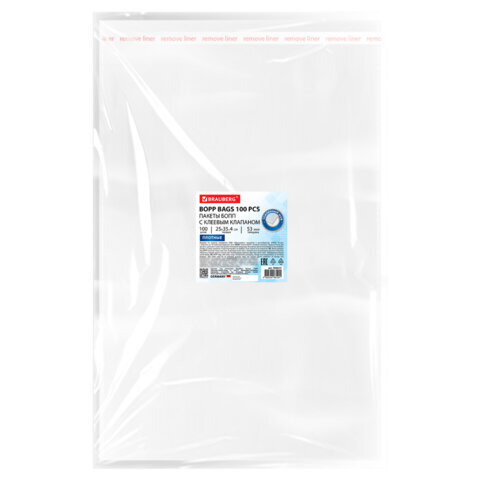 Пакеты БОПП с клеевым клапаном, КОМПЛЕКТ 100 штук, 25х35 + 4 см, 53 мкм, с усиленным швом, BRAUBERG, 700417