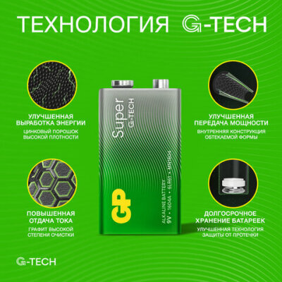 Батарейка 1 шт., GP Super G-Tech, Крона (6LR61, 6LF22, 1604A), алкалиновая, в пленке, 1604A-5S1
