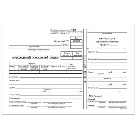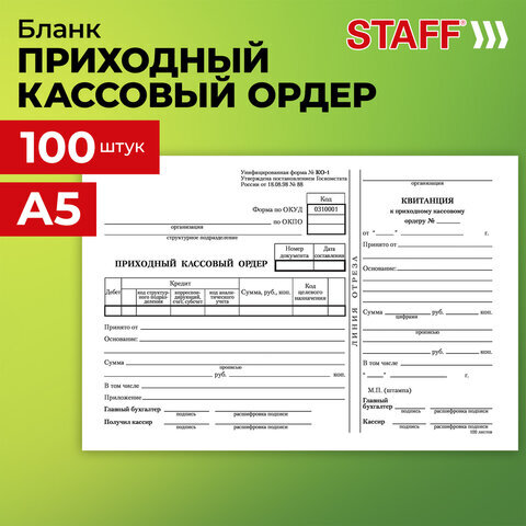 Бланк бухгалтерский, офсет, "Приходный кассовый ордер", А5 (135х195 мм), СПАЙКА 100 шт., STAFF, 130131