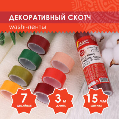 Клейкие WASHI-ленты для декора "ИНТЕНСИВ", 7 теплых цветов, 15 мм х 3 м, рисовая бумага, ОСТРОВ СОКРОВИЩ, 661698