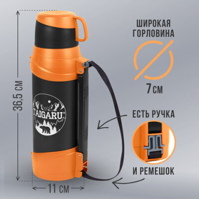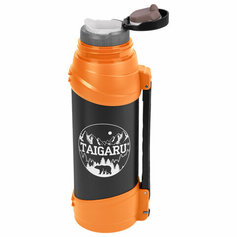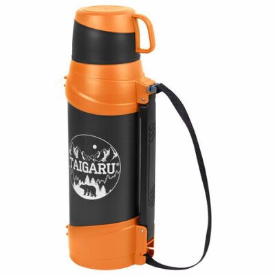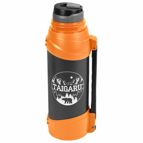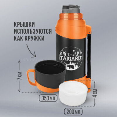 Термос классический, нержавеющая сталь, 2 л, оранжево-серый, 2 кружки, ручка + ремешок, TAIGARU (ТАЙГАРУ), 608817