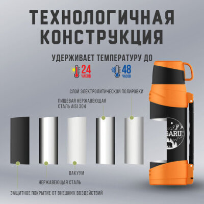 Стильный и надежный термос TAIGARU сделан из высококачественной пищевой нержавеющей стали AISI 304. Идеально подходит для хранения горячих и холодных напитков. Двойные стенки позволяют удерживать высокую температуру до 24 часов, низкую до 48 часов.