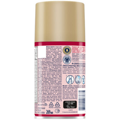 Аромат с кокетливыми нотами сочных ягод, благоухающих цветов и сладкой ванили. GLADE гарантирует безопасность и экспертную формулу своих аэрозолей.