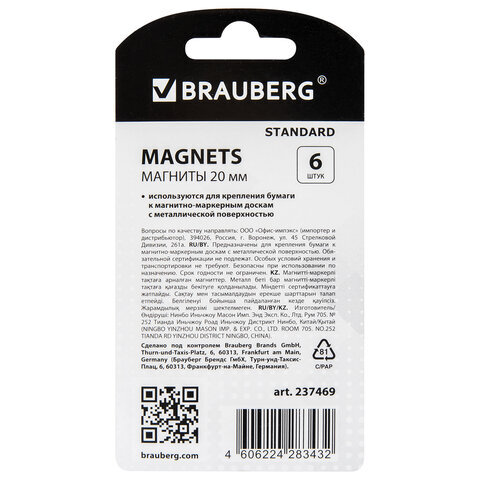 Стильные магниты BRAUBERG "STANDARD" помогут надежно прикрепить листы бумаги к магнитной поверхности досок, витрин и флипчартов.