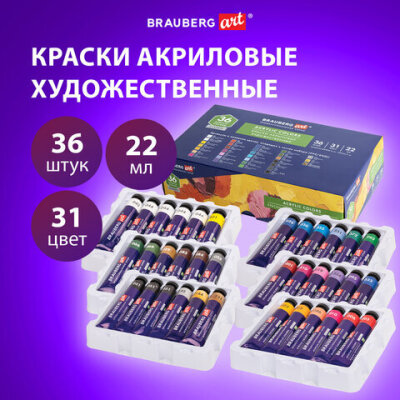 Краски акриловые художественные, НАБОР 36 штук, 31 цвет, в тубах по 22 мл, BRAUBERG ART CLASSIC, 192245
