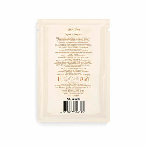 Шампунь одноразовый 10 мл, КОМПЛЕКТ 500 шт., GRASS SARGAN, саше, флоупак, 125208