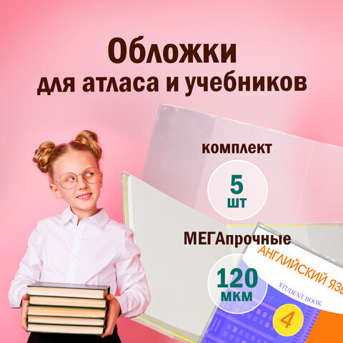 Обложки ПВХ для учебников и тетрадей А4, контурных карт БОЛЬШОГО ФОРМАТА, КОМПЛЕКТ 5 шт., ПЛОТНЫЕ, 120 мкм, 302х440 мм, ПИФАГОР, 224845