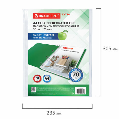 Перфорированные папки-файлы BRAUBERG "EXTRA 700" предназначены для хранения документов в папке с любым кольцевым механизмом или скоросшивателем.