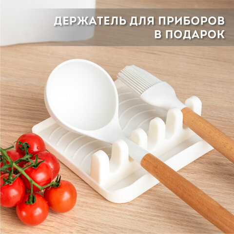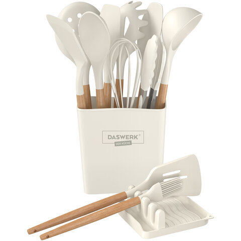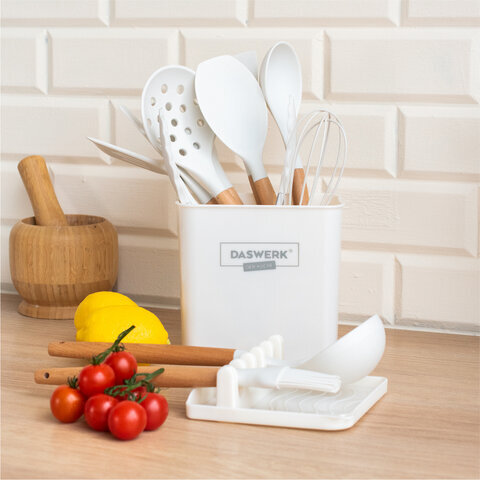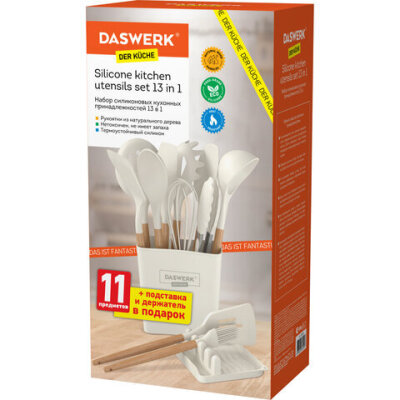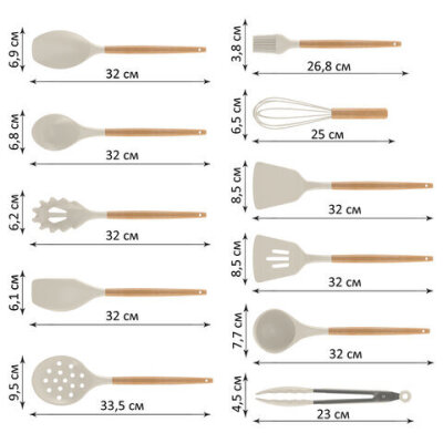 | Состав набора | лопатка для жарки, шпатель, венчик, щипцы, плоская ложка для выпечки, лопатка с отверстиями для слива масла, половник, ложка для салата, кисточка для масла, ложка для спагетти и шумовка |