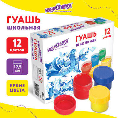 Гуашь ЮНЛАНДИЯ "ШКОЛЬНАЯ", 12 цветов по 17,5 мл, 192384