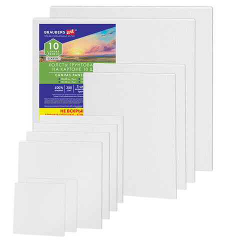 Холсты на картоне НАБОР № 1 10 штук, хлопок, грунт, 280 г/м2, BRAUBERG ART CLASSIC, 192660