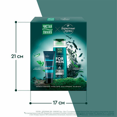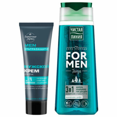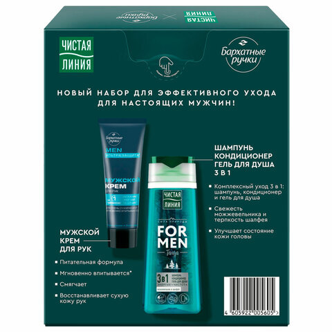 Оптимальный выбор для заботы о коже рук и бережного очищения волос и кожи. В набор входят шампунь для волос 3 в 1 ЧИСТАЯ ЛИНИЯ и мужской крем для рук БАРХАТНЫЕ РУЧКИ.