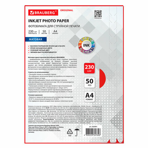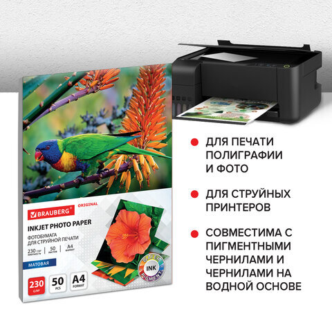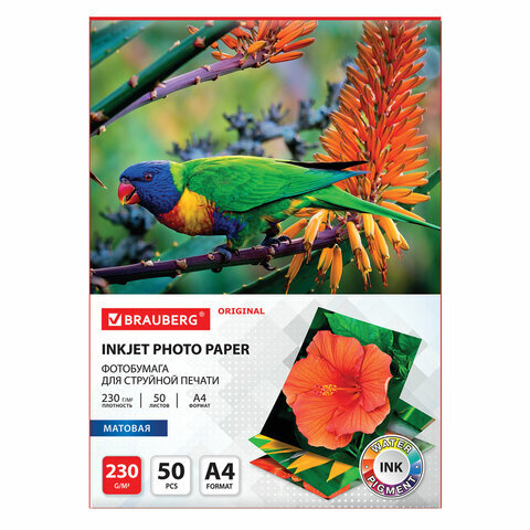 Фотобумага матовая, А4, 230 г/м2, односторонняя, 50 листов, BRAUBERG ORIGINAL, 363991