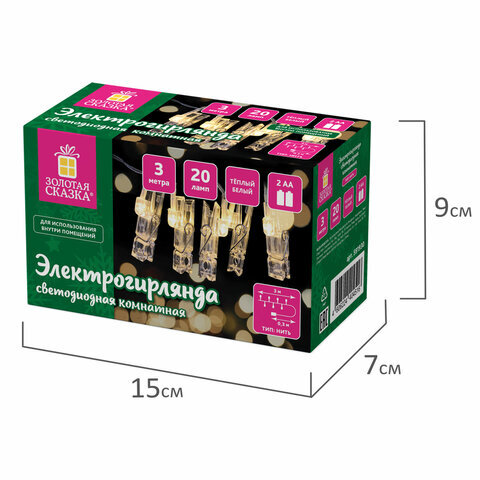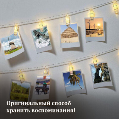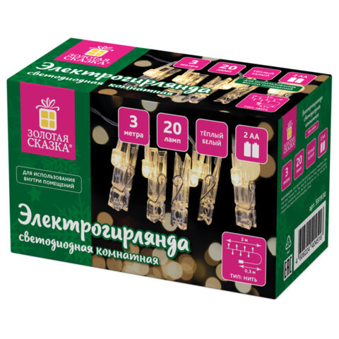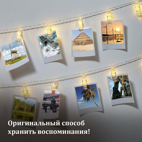 Электрогирлянда-нить комнатная "Прищепки" 3 м, 20 LED, теплый белый свет, на батарейках, ЗОЛОТАЯ СКАЗКА, 591930