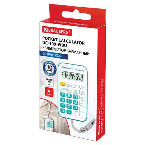Калькулятор карманный со шнурком BRAUBERG DC-109-WBU (61x110 мм), 8 разрядов, БЕЛЫЙ/ГОЛУБОЙ, 272645