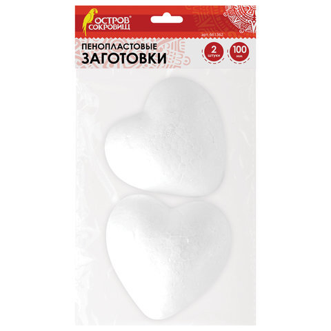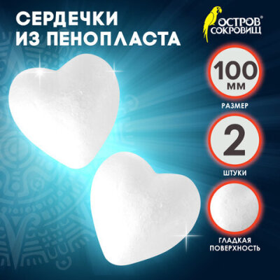 Пенопластовые заготовки для творчества "Сердечки", 2 шт., 100 мм, ОСТРОВ СОКРОВИЩ, 661362