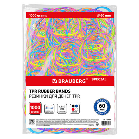 Резинки банковские TPR универсальные, диаметр 60 мм, 1000 г, ЯРКИЕ ЦВЕТА, BRAUBERG SPECIAL, 440194