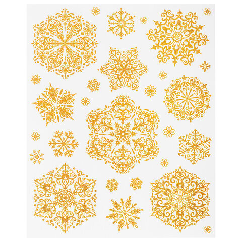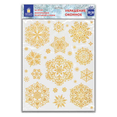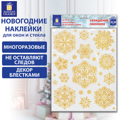 Наклейка для окон двусторонняя МНОГОРАЗОВАЯ 30х38 см "Снежинки" глиттер, золото ЗОЛОТАЯ СКАЗКА, 591190