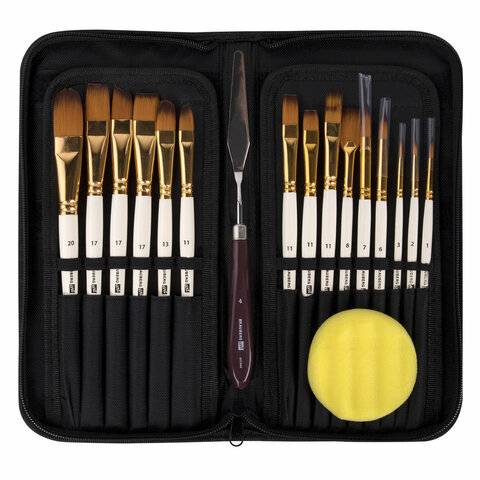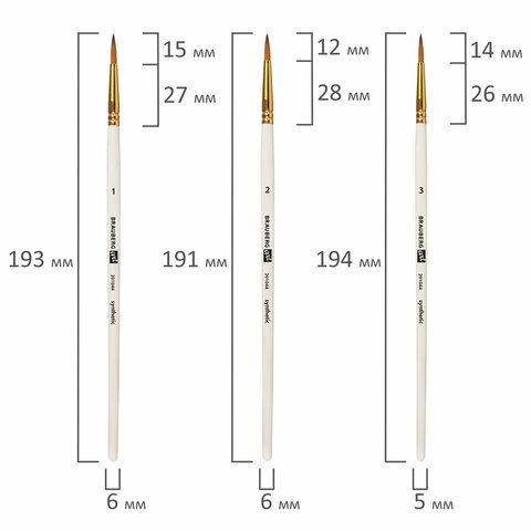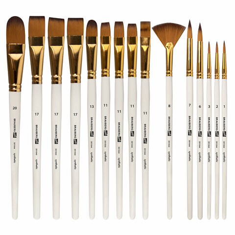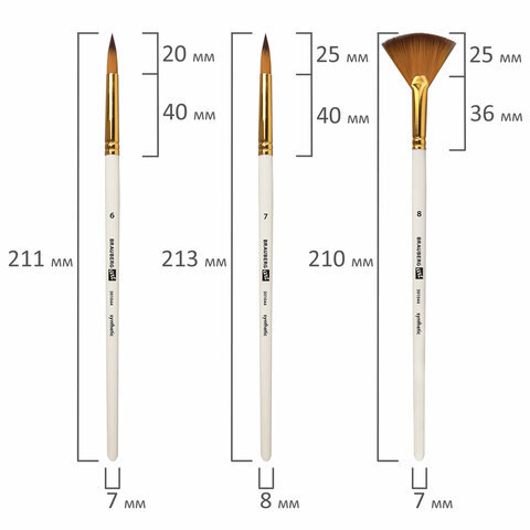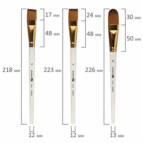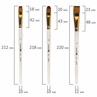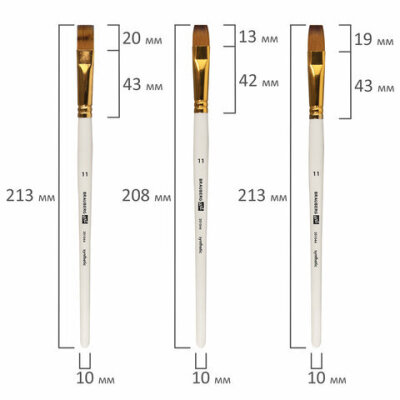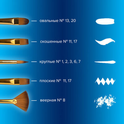 | Номер кисти | скошенные - № 11, № 17; плоские - № 11, № 17; веерная - № 8; круглые - № 1, № 2, № 3, № 6, № 7; овальные - № 13, № 20 |