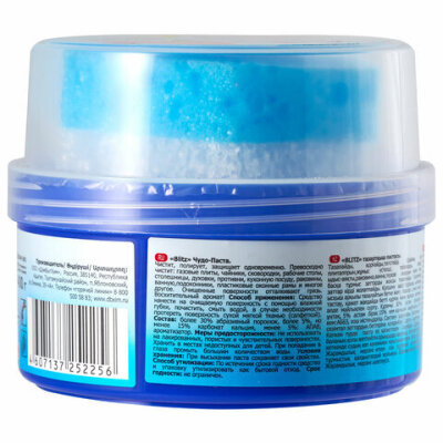 • Чистящая паста BLITZ эффективно удаляет загрязнения и полирует очищаемую поверхность благодаря содержанию силиконовых компонентов. Очищенные поверхности отталкивают грязь.