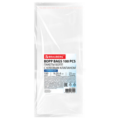 Пакеты БОПП с клеевым клапаном, КОМПЛЕКТ 100 штук, 9х20 + 4 см, 25 мкм, с усиленным швом, BRAUBERG, 700403