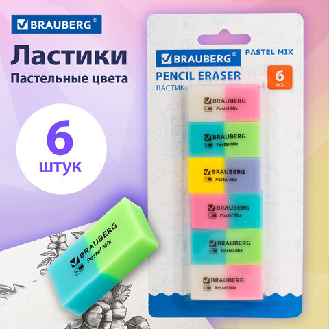 Набор ластиков BRAUBERG "Pastel Mix", 6 шт., цвета ассорти, 44х21х10 мм, экологичный ПВХ, 229597