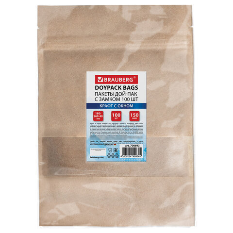 Пакеты дой-пак с замком ZIP LOCK, крафт с окном 60 мм, 180х260 + 40 мм, КОМПЛЕКТ 100 штук, 150 мкм, BRAUBERG, 700693