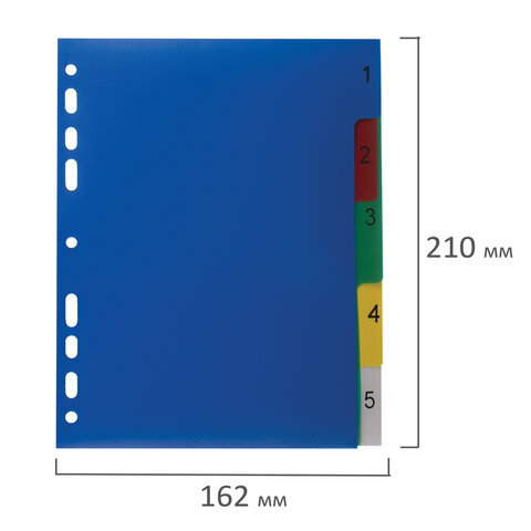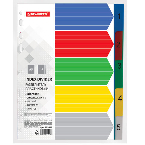Разделитель пластиковый МАЛЫЙ ФОРМАТ (210x162мм), А5, 5 листов, цифровой 1-5, оглавление, BRAUBERG, 225628