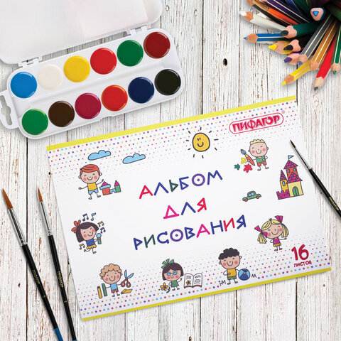 • Альбом для рисования ПИФАГОР предназначен для детей дошкольного и младшего школьного возраста. Яркая, красочная обложка.