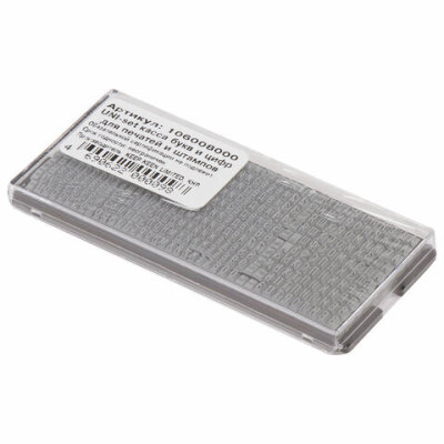 Универсальная касса из высококачественной резины с оптимальным набором букв, цифр и знаков (UNI-set). Используется в самонаборных печатях и штампах GRM. Прочное крепление, каждый символ имеет одну "ножку".