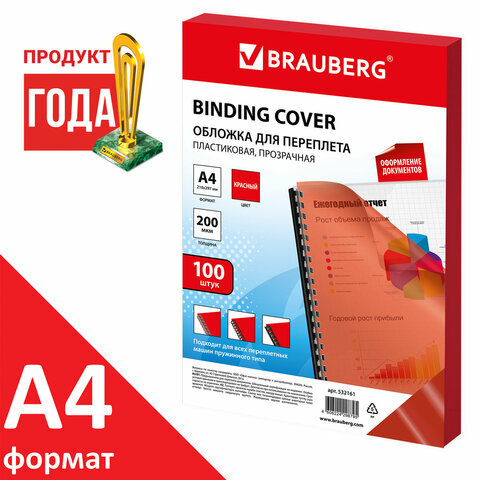 Обложки пластиковые для переплета, А4, КОМПЛЕКТ 100 шт., 200 мкм, прозрачно-красные, BRAUBERG, 532161